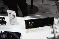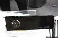 Sparkle computer's CeBIT bit booth featured an eye-catching new graphics card, the Sparkle One GTX 570. This is the first air-cooled single-slot GeForce GTX 570 series graphics card. While it is thin, the card is extremely long. We estimate around 13-inches long, if not more. Sparkle seems to be making use of the extra length to squeeze in as much metal (heatsink) as possible. A fan pushes air backwards. The card features clock speeds of 752/1504/4000 MHz (core/shader/memory).