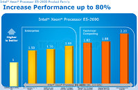 In its presentation, Intel claims up to 80 percent performance increments over the previous-generation Westmere-EP platform. A single Xeon X5690 six-core processor was set as a base line, and compared to a single Xeon E5-2690 eight-core processor. The chips were put through several enterprise performance and throughput tests, including OLTP Database (TPC-C Oracle), Middle-Tier Java (SPECjbb 2005), Integer Throughput (SPECint_base2006), Floating Point Throughput (SPECfp_rate_base2006), Memory Bandwidth (STREAM_MP Triad), and Matrix Multiplication (Linpack). Its results are graphed below.Additionally, Intel talked about its new Data Direct I/O Technology (DDIO), which works to increase I/O performance by up to 2.3 times that of previous generation, and along with it, reductions in system latencies and power draw. So what does all this mean to PC enthusiasts? Simple, if you're going to opt for EVGA's SuperRecord 3 enthusiast platform, these are the chips you'll need to buy.TechPowerUp does not vouch for the authenticity of these slides, or the information contained in them.