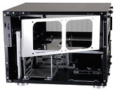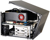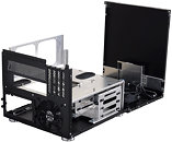 The Lian Li PC-V358 has a two compartment design that separates the hardware into heat zones. The top section holds the motherboard, graphics card and 2.5" drives, while the bottom compartment holds the PSU and 3.5" hard drives.
