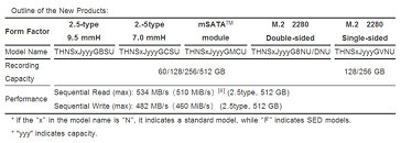 All models in the series integrate a 6Gbit/s SATA interface and have a maximum sequential read speed of 534 MB/s (512 GB model). They offer fast booting and application starts, and their low power consumption help to improve battery life in mobile devices. The HG6 series is suitable for notebook PCs, workstations, thin clients, server boot drives and read-intensive enterprise applications.
