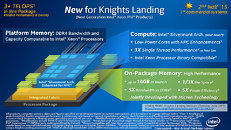 Powered by more than 60 HPC-enhanced Silvermont architecture-based cores, Knights Landing is expected to deliver more than 3 TFLOPS of double-precision performance and three times the single-threaded performance compared with the current generation. As a standalone server processor, Knights Landing will support DDR4 system memory comparable in capacity and bandwidth to Intel Xeon processor-based platforms, enabling applications that have a much larger memory footprint. Knights Landing will be binary-compatible with Intel Xeon processors, making it easy for software developers to reuse the wealth of existing code.