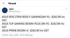 AMD's upcoming B550 desktop chipset, which plays second-fiddle to the premium X570, could bring relief to gaming PC builders wanting to put together 3rd gen Ryzen desktops with PCI-Express gen 4.0 graphics and M.2 SSD connectivity on the cheap. Pricing of a handful ASUS B550 motherboards was leaked to the web by Australian retailer ICIT.net.au, who listed the somewhat premium ASUS ROG Strix B550-F Gaming for AUD $262.90, including GST (converts to USD $167 including all taxes). The retailer also lists TUF B550-Plus Gaming and Prime B550M-A at the same exact price, which could be pre-launch inflation (so we're going by the price of what could be the best-endowed SKUs among the three).