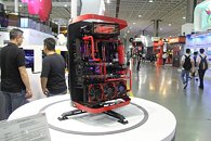 Here's the first picture of the second-generation X-Frame, In Win's iconic case that created a new form-factor. The new X-Frame features swivel base with legs, to which a black base plate is attached on a pivot. This plate is also the motherboard tray, and holds the various other parts of the case together. There's room for all your liquid cooling gear on this side of the case. The reverse side features drive bays.
