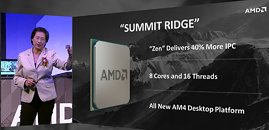 AMD CEO Lisa Su, speaking at the company's Computex reveal held up the most important CPU product for the company, the new eight-core "Summit Ridge" processor. A posterboy of the company's new "Zen" micro-architecture, "Summit Ridge" is an eight-core processor with SMT enabling 16 threads for the OS to deal with, a massive 40% IPC increase over the current "Excavator" architecture, and a new platform based around the AM4 socket.