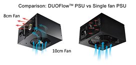 REVOLUTION DUO is equipped with DUOFlow design, consisting of two ENERMAX patented Twister Bearing fans, 1* 10cm intake fan and 1* 8cm exhaust fan. Thanks to active ventilation, DUOFlow makes lower RPM of fans; the use of Twister Bearing technology also delivers a more silent cooling performance compared with regular single fan PSU .Patented FMA technology provides extra cooling for system when need
