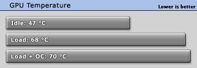 Sapphire successfully lowered the idle and load temperatures compared to the AMD Radeon HD 4850 reference design. This improvement, however, comes at a cost. As mentioned before, the fan noise of the card is quite loud. The more sensible solution would have been a quieter fan with slightly higher temperatures.